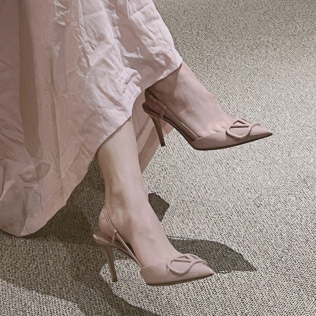 包头V扣裸粉色凉鞋女2023年新款法式夏季尖头单鞋高跟后空细跟鞋