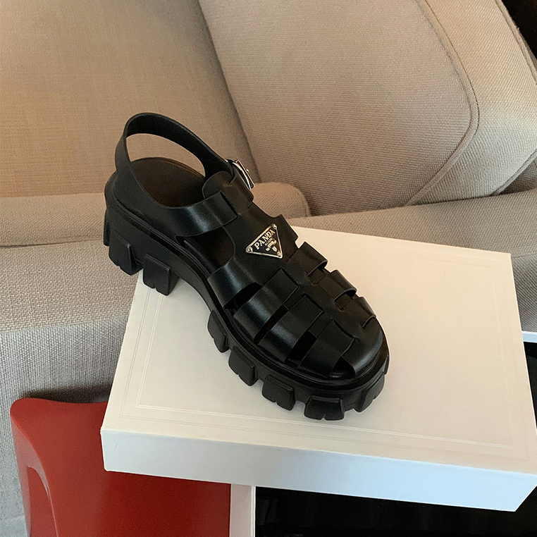 头层牛皮~露趾后绊带厚底真皮凉鞋女夏天新款显脚小平底罗马凉鞋