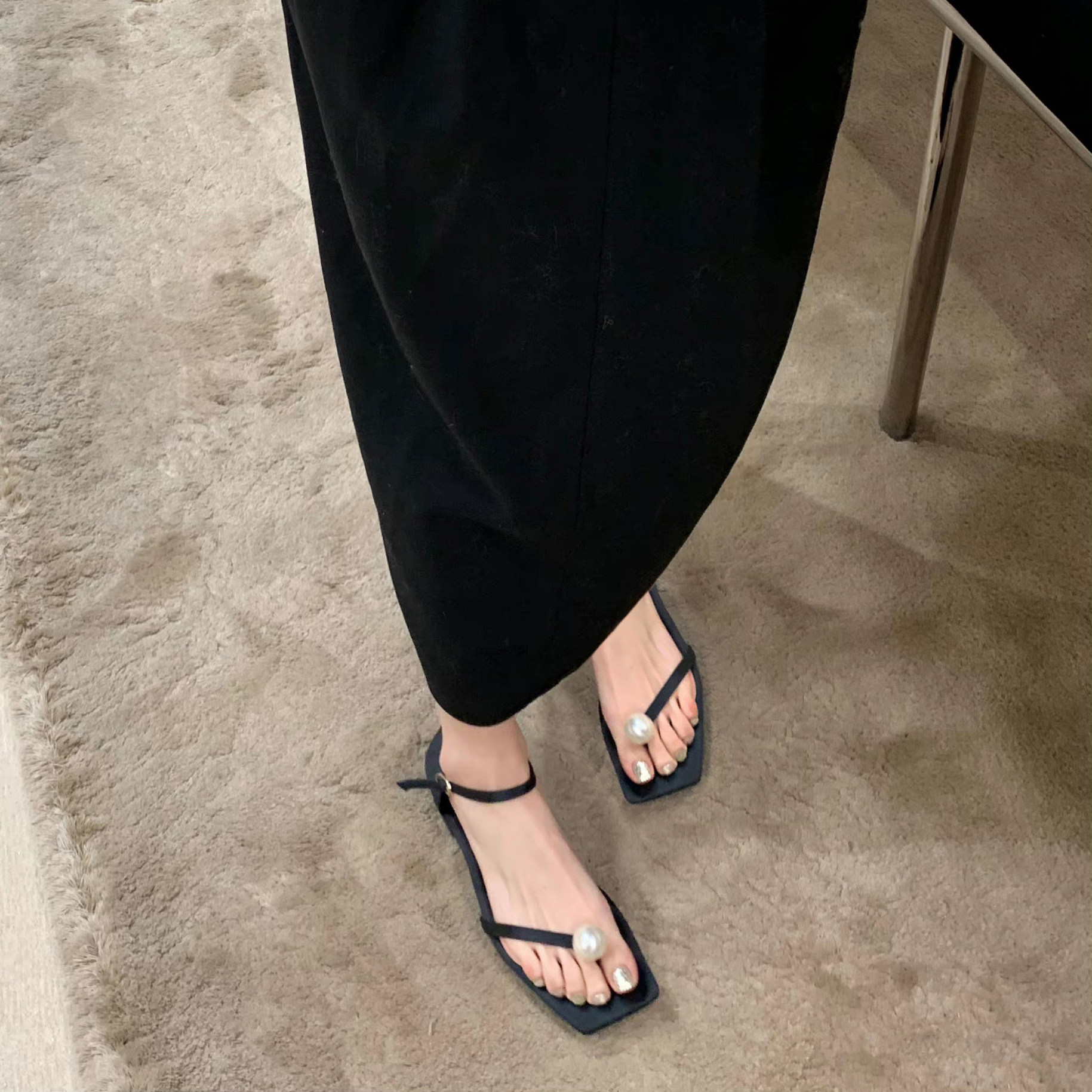 羊皮版~简约方头珍珠夹趾一字带粗跟凉鞋女夏天法式小跟真皮凉鞋