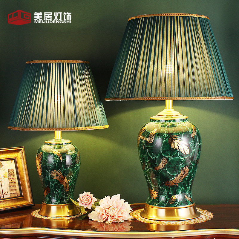 中式美式台灯大号客厅卧室床头灯全铜陶瓷绿色复古典创意美居灯饰