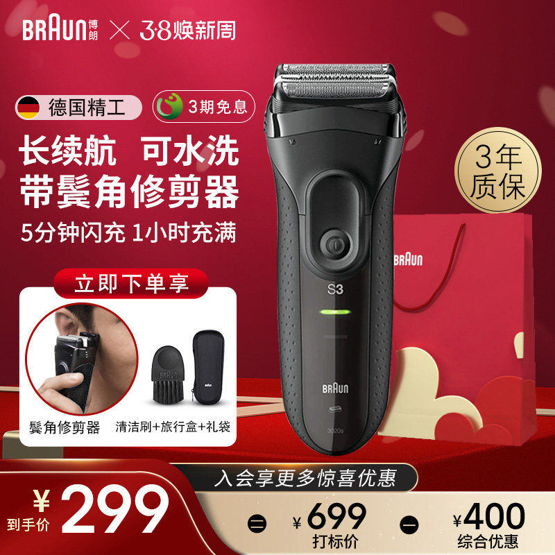 博朗剃须刀男士电动刮胡刀3系3020s往复式快充便携水洗 进口刀头