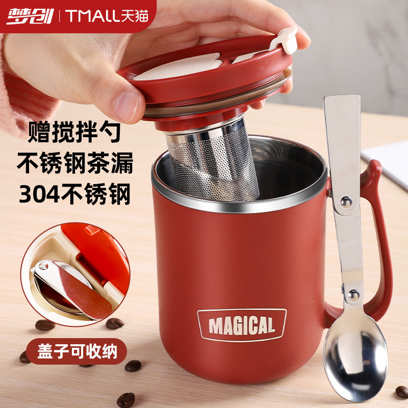 马克杯304不锈钢泡茶杯茶水分离杯子男款水杯办公室咖啡杯带盖勺