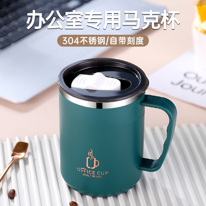 马克杯不锈钢防摔带盖学生宿舍刻度牛奶杯男女家用水杯办公咖啡杯
