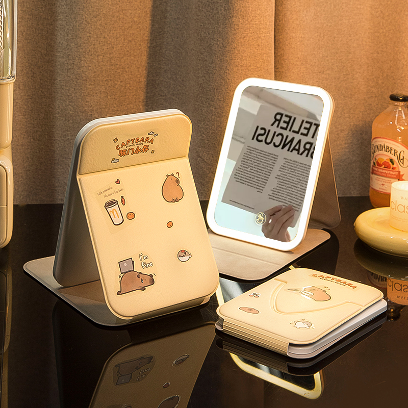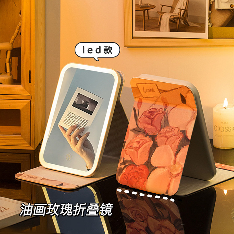 化妆镜LED带灯学生宿舍台式桌面小镜子梳妆台便携随身折叠镜家用