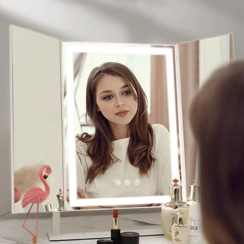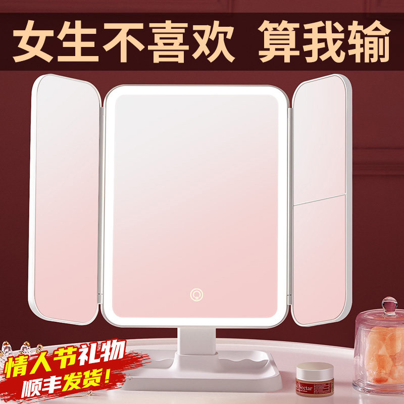 网红三折化妆镜台式家用带灯可折叠补光桌面梳妆镜梳妆台便携镜子