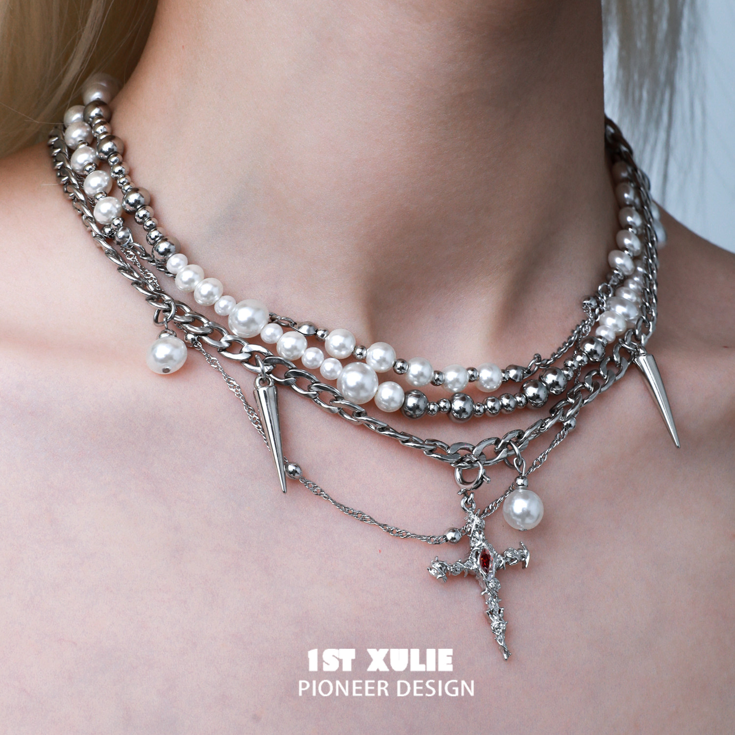 1STXULIE可拆4条十字架珍珠项链原创小众设计多层链条毛衣锁骨链