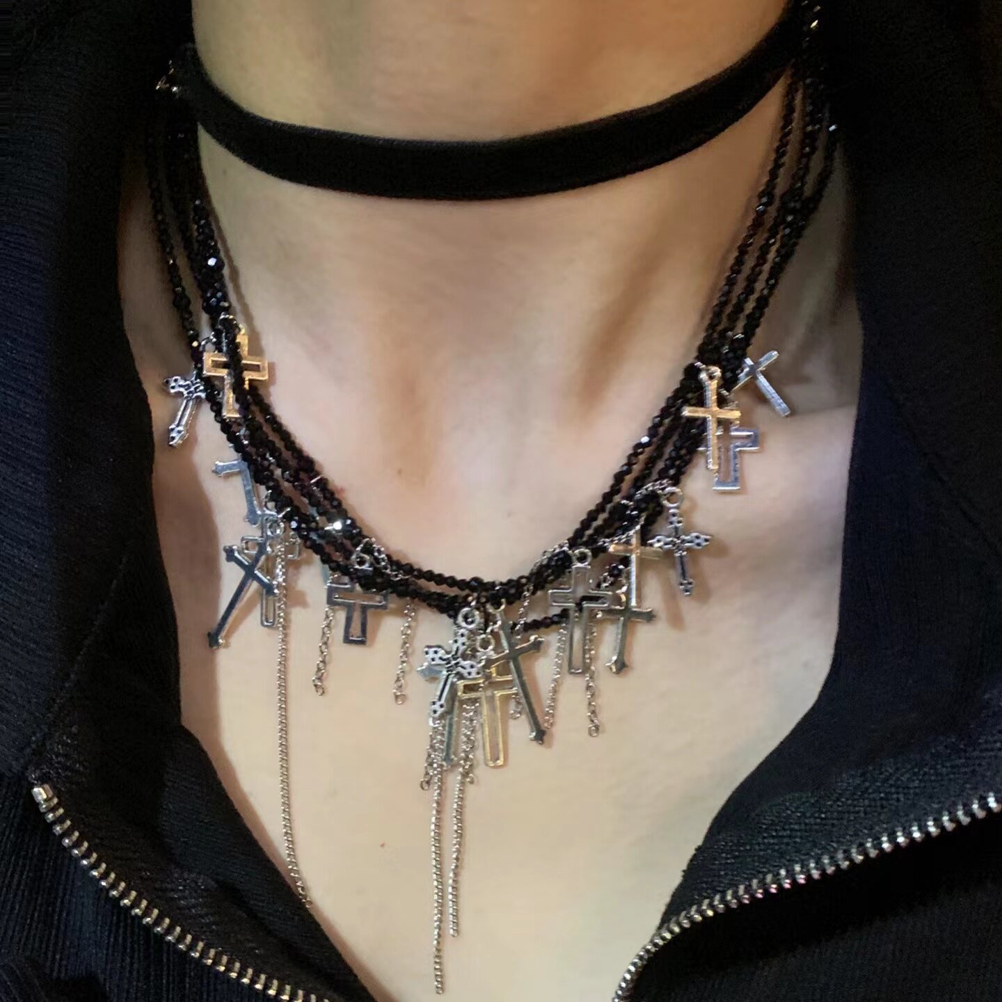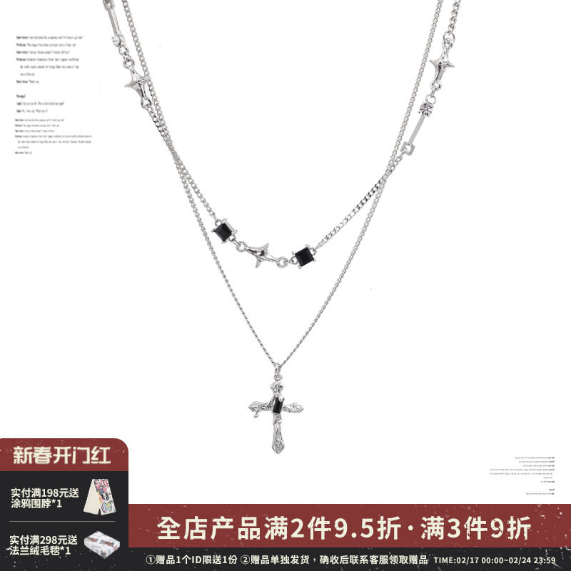 暗黑辣妹风~锆石十字架双层项链女夏季长款小众轻奢ins叠戴锁骨链