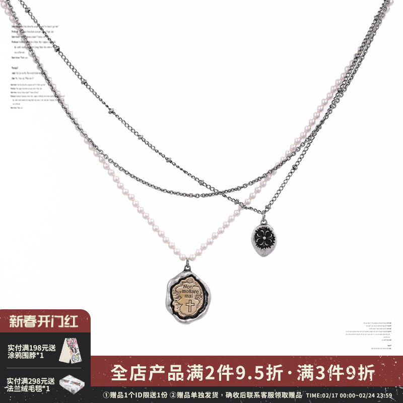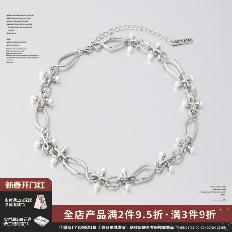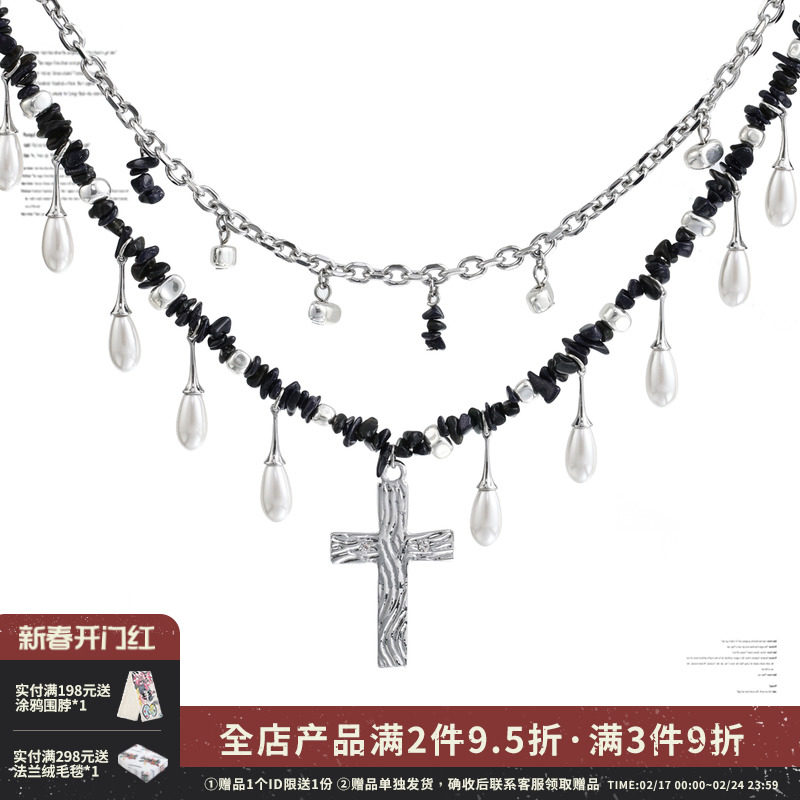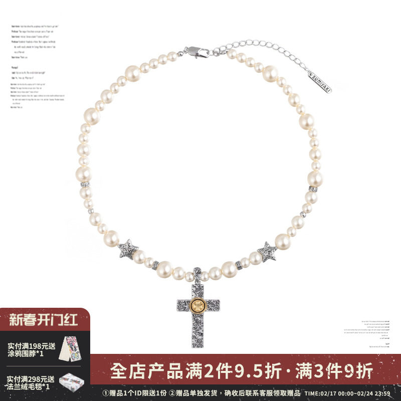 SUMIYAKI 古着感废土感项链 十字架黑白珍珠双层项链女吊坠