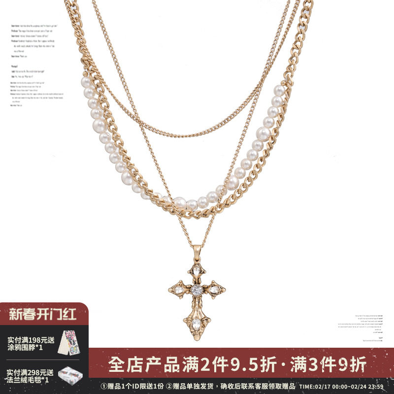 OUKECHUN十字架双层叠戴拼接珍珠项链女ins嘻哈冷淡风锁骨链配饰