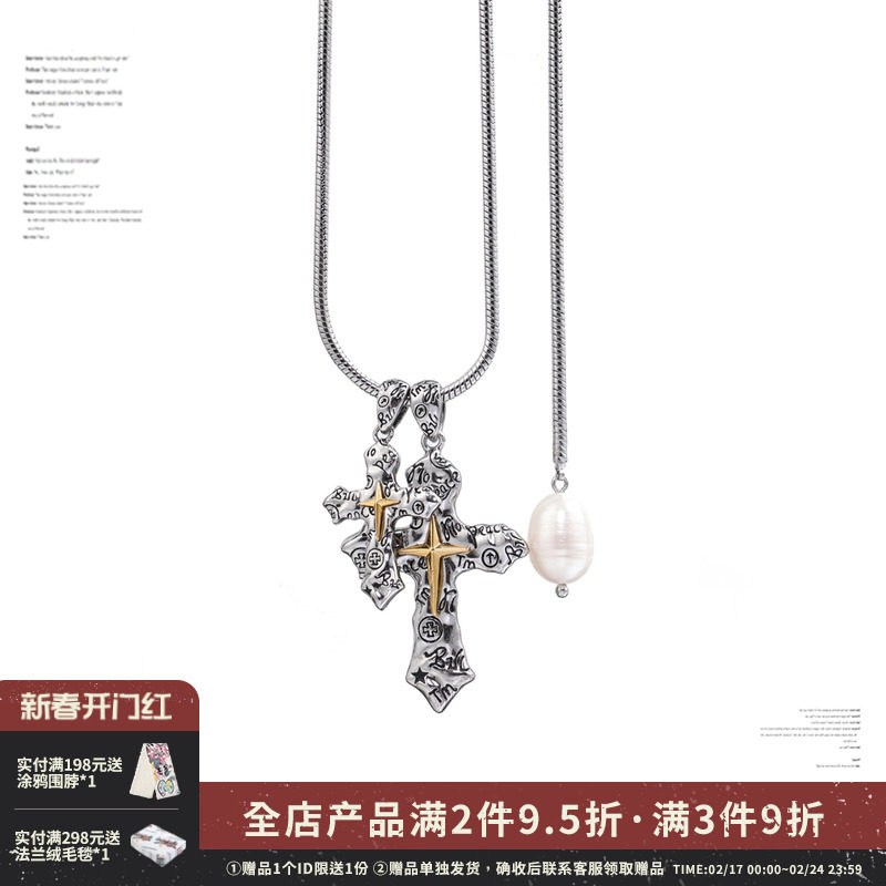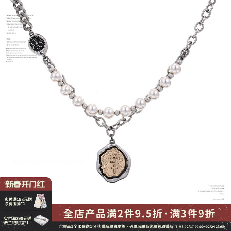 SUMIYAKI美式古币金银撞色涂鸦珍珠十字架项链女多层复古小众吊坠