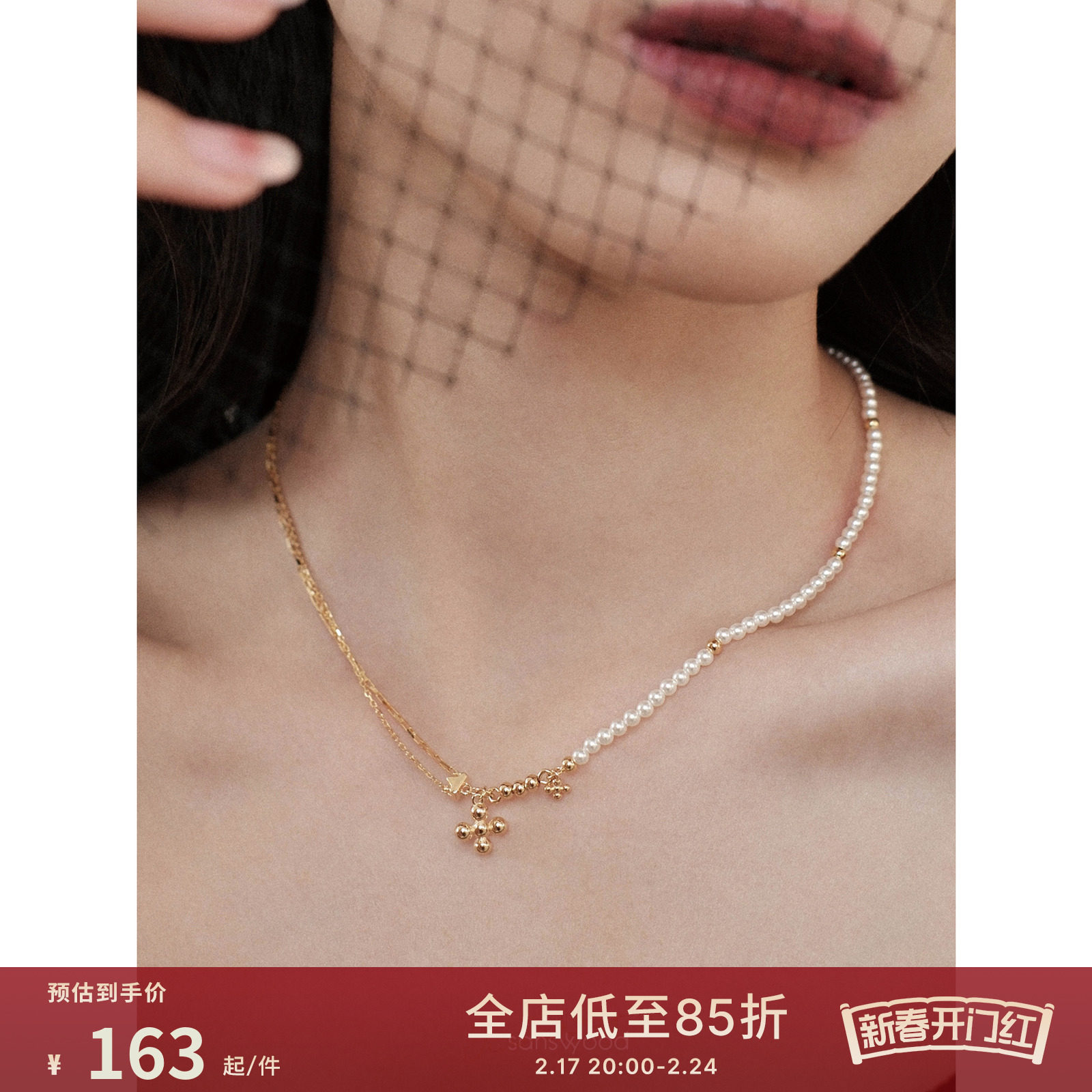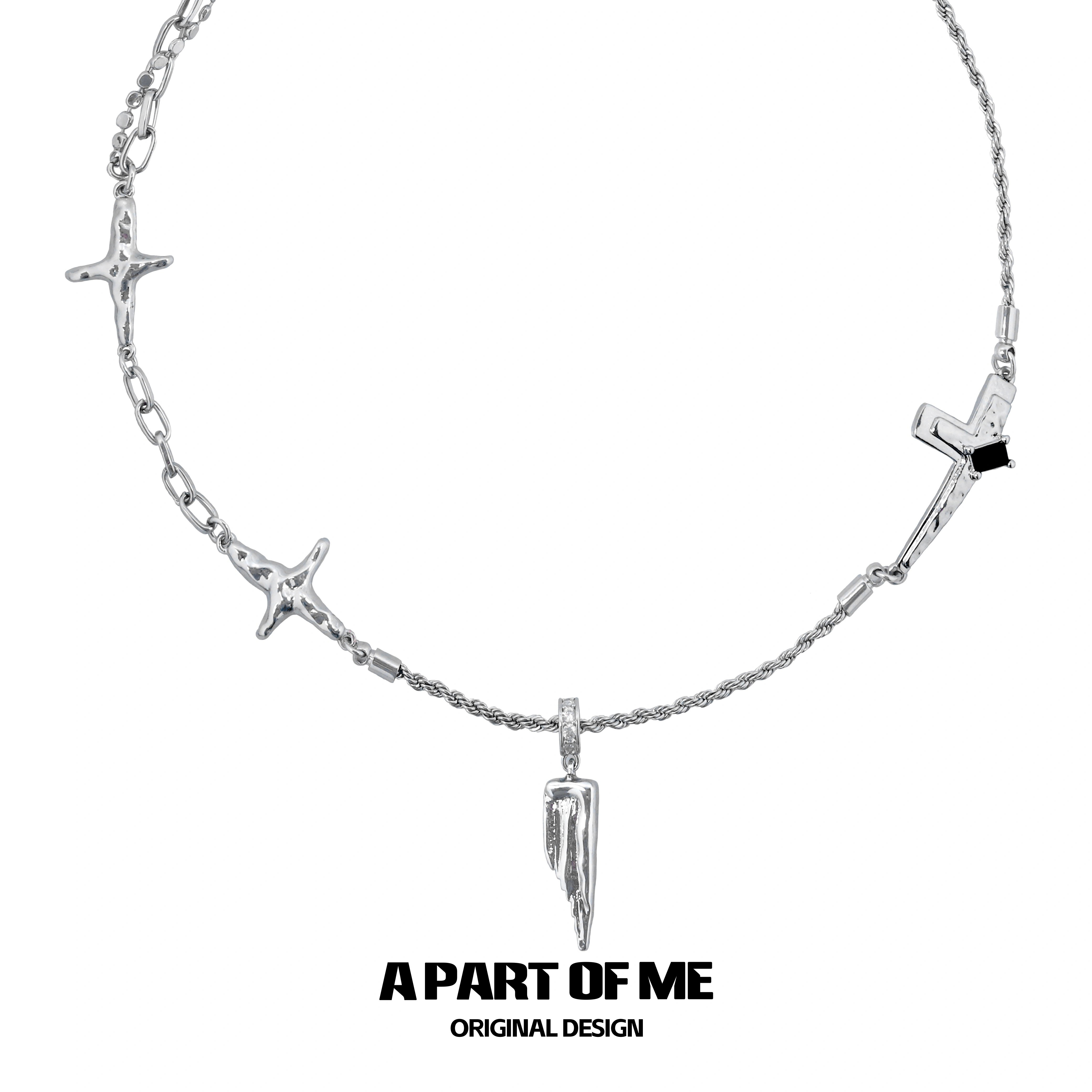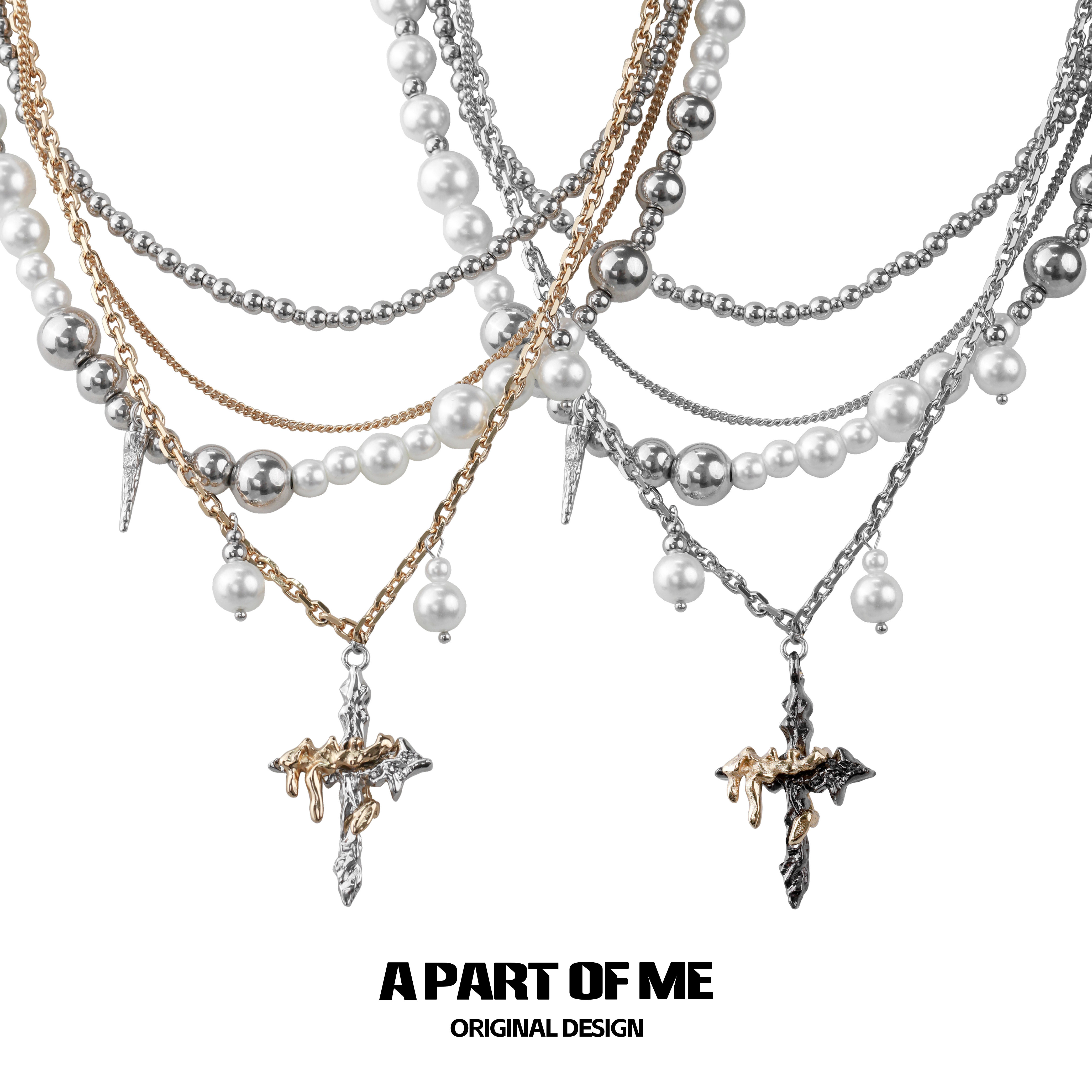 sanswood《半面妆》原创半珠半链小众银镀金十字架拼接锁骨项链