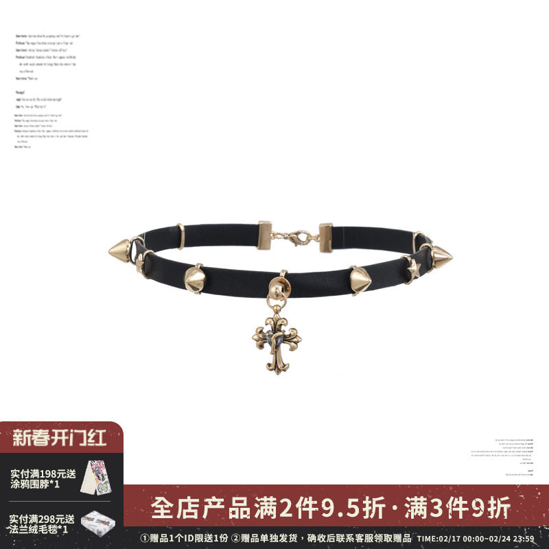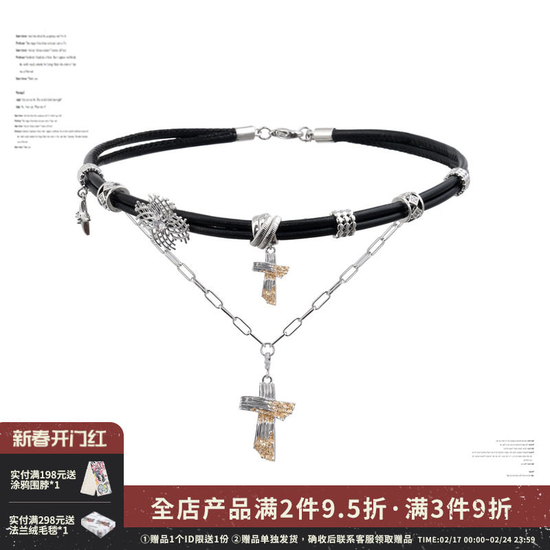 张元英同款黑色十字架choker项圈女小众双条叠戴项链皮质颈链y2k