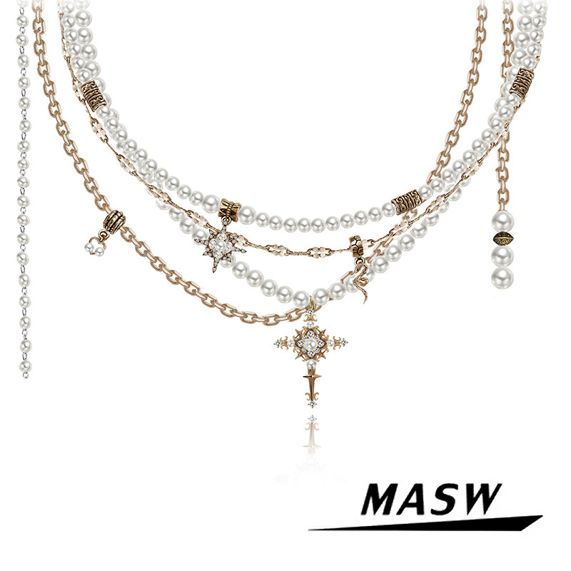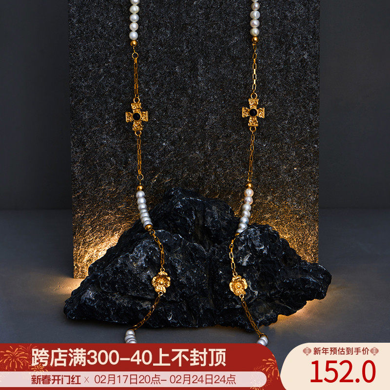 SUMIYAKI 美式巴洛克珍珠十字架项链 高级感哑古金多层叠带毛衣链