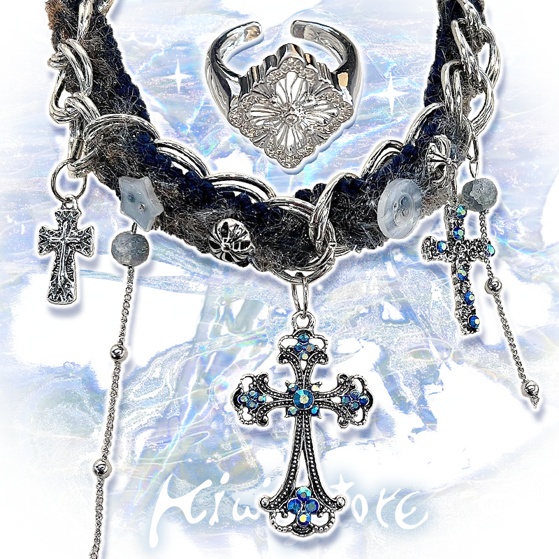 Y2K蓝钻十字架重工毛绒chocker项链辣妹亚文化甜酷千禧小众高级潮