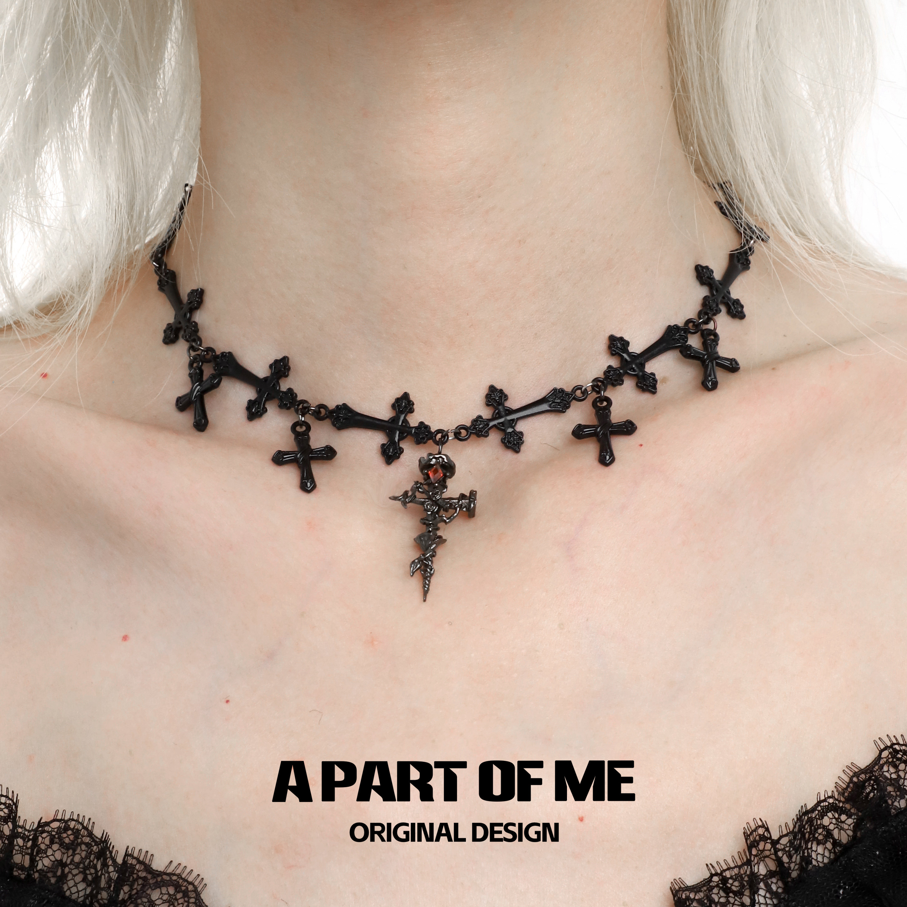 新款配饰小众缠绕黑宝石十字架拼接项链男女蹦迪钛钢锁骨链潮