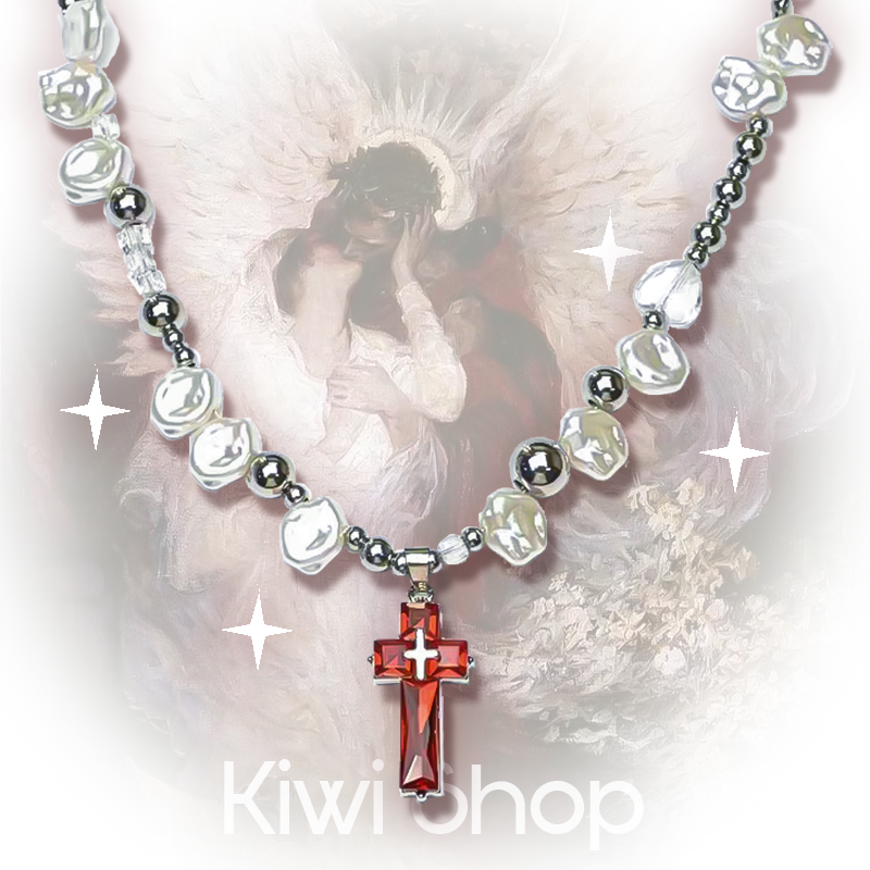 Y2K酒红十字架珍珠项链千禧辣妹美式哥特甜酷亚文化小众复古朋克