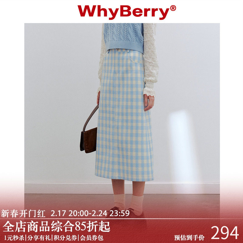 WhyBerry 23AW“海盐气泡”蓝白格子半身裙简约撞色长款A字裙女