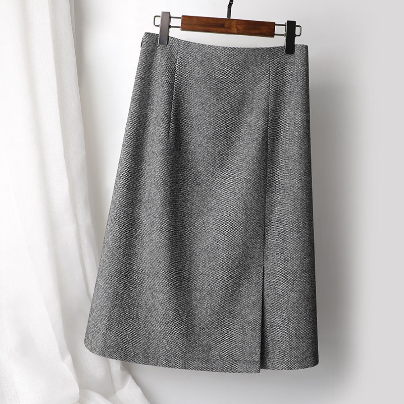 2023秋季新款羊毛半身裙中长款显瘦A字裙前开叉工作裙灰色工装裙