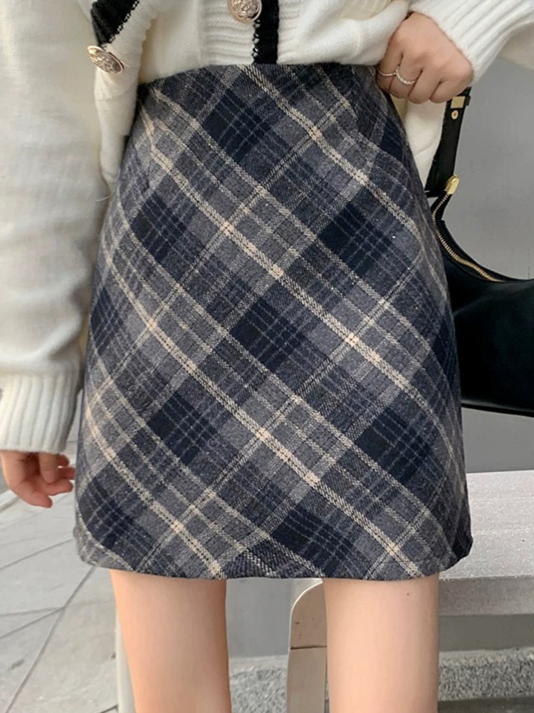 格子毛呢半身裙秋冬小个子大码女装梨形身材遮胯显瘦包臀a字短裙