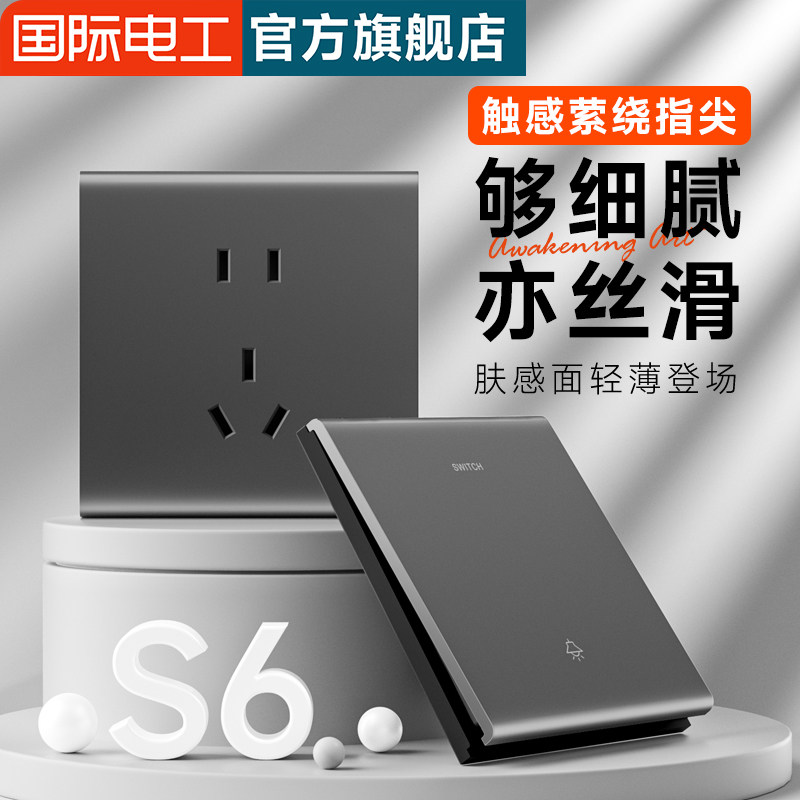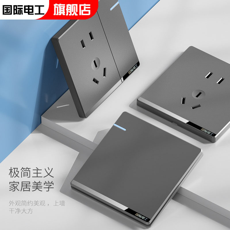国际电工灰色肤感超薄一开单控开关插座面板86型暗装双控16A空调