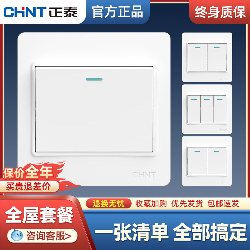正泰单控开关面板一位四单开双开床头电灯光三联按钮家用86型墙壁