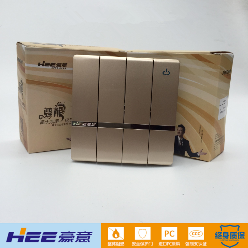 HEE豪意开关插座四开双控四位单开 无框无影开关香槟金色86型开关