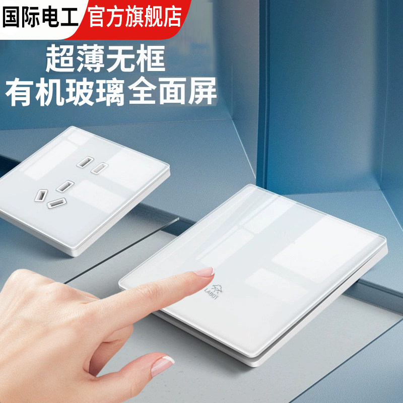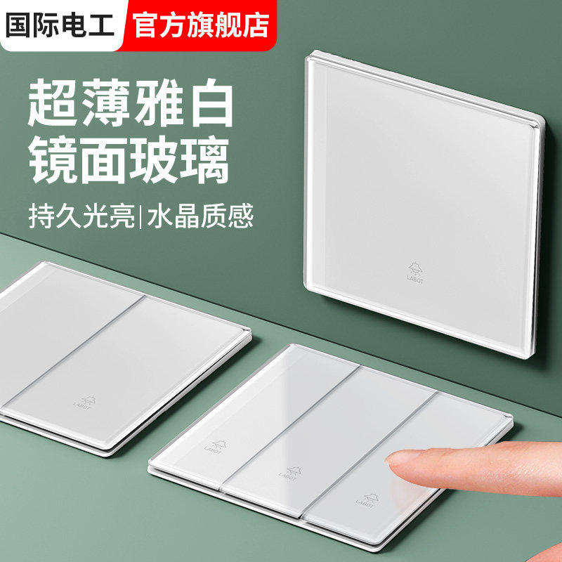 国际电工超薄86型白色玻璃镜面开关单双控五孔暗装16空调插座面板