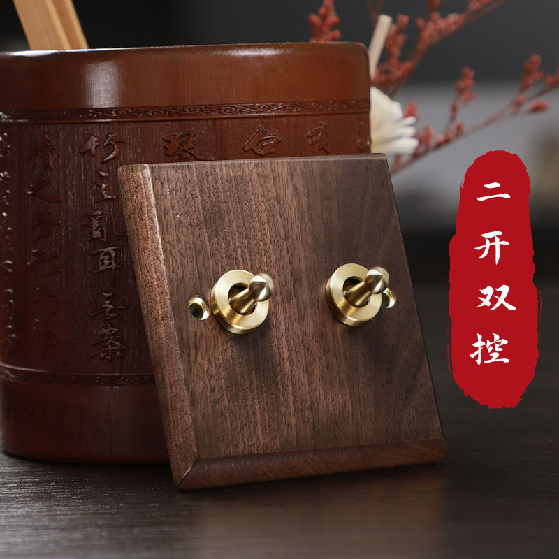 美式胡桃木开关面板插座黄铜拨杆复古单双开双控开关两开双控面板