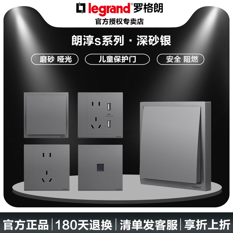 罗格朗开关面板家用朗淳深砂银一开单控五孔插座灰色86型墙壁电源