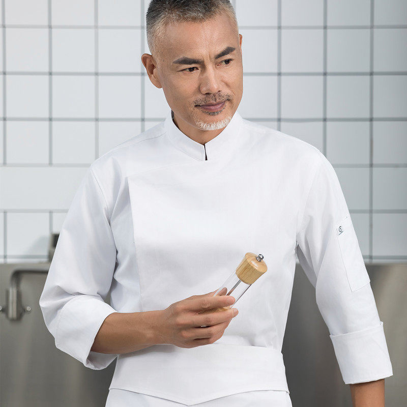 高端行政总厨拉链工作服长袖白色男酒店厨师长饭店西餐厨房秋冬装
