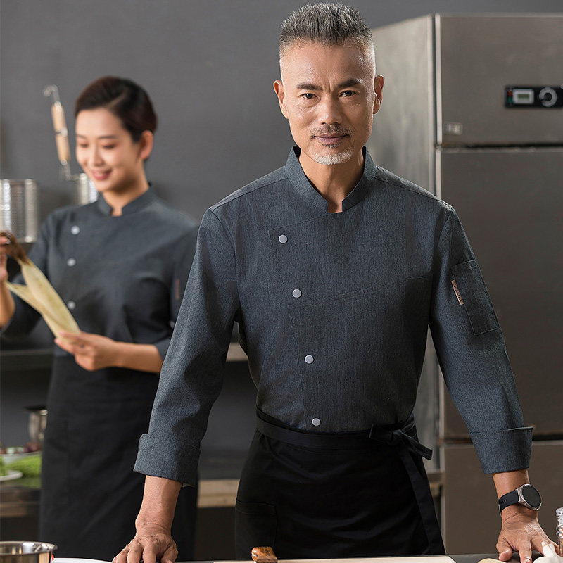 特斯美高端酒店厨师工作服男女纯棉蛋糕烘焙食堂总厨灰色秋冬工装