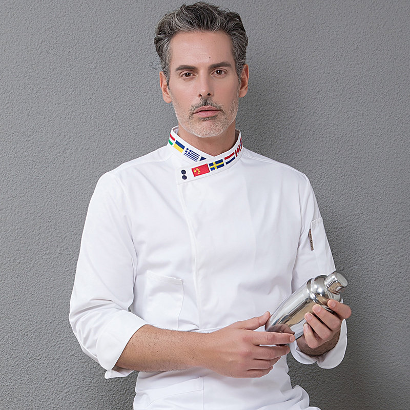 特斯美高端酒店餐饮厨师长工作服纯棉白色厨房行政总厨绣国旗工装