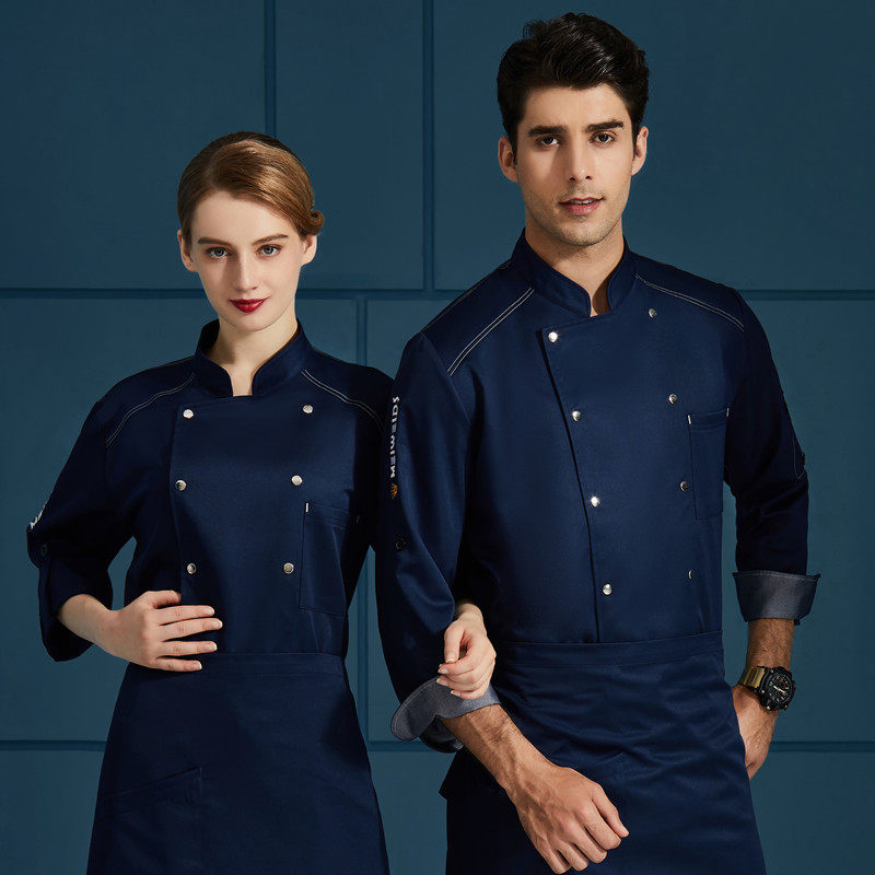 高端酒店厨师工作服蓝色男女厨房食堂烤肉饭店西餐厨师服长袖秋季