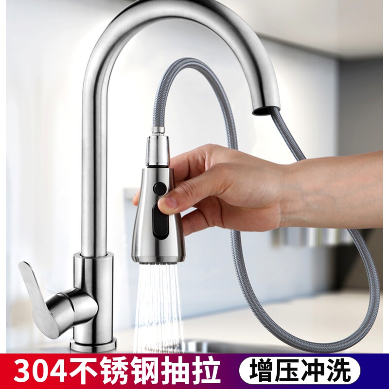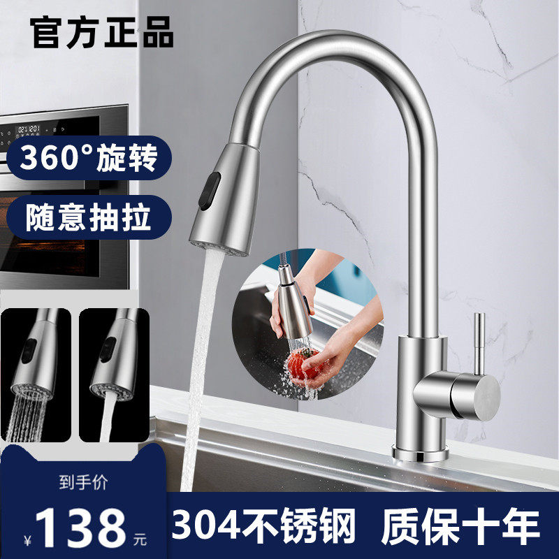 网红厨房304不锈钢水龙头冷热抽拉式洗菜盆水槽伸缩可旋转无铅高