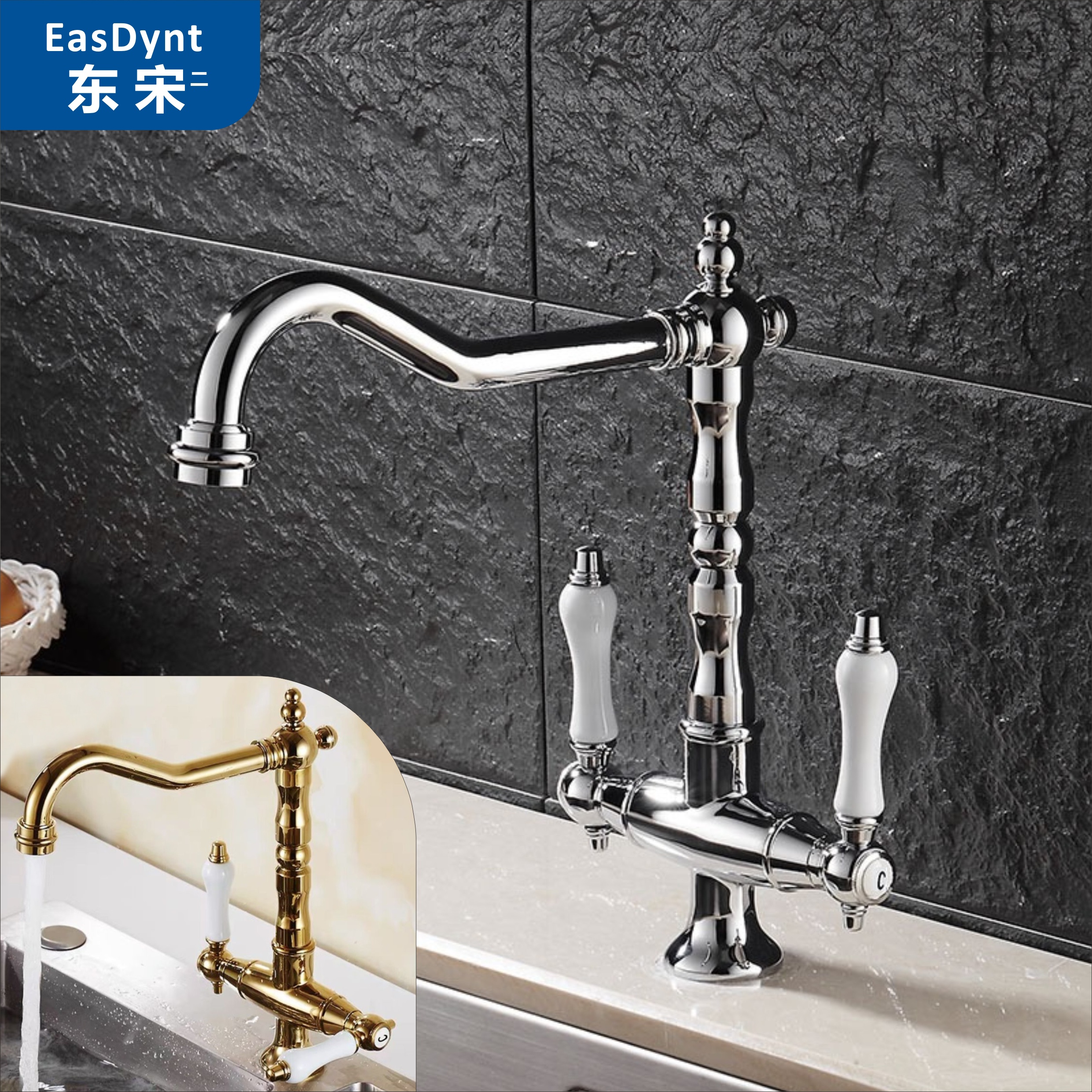 包邮1双把铜材质水龙头厂家跨境厨房冷热双阀芯金色水槽洗菜盆