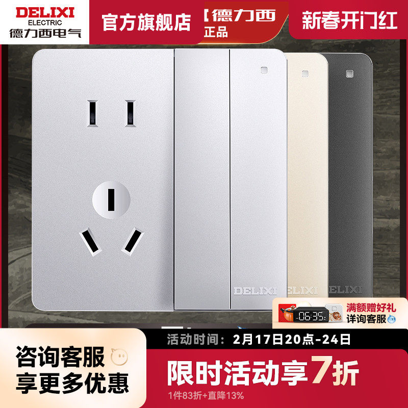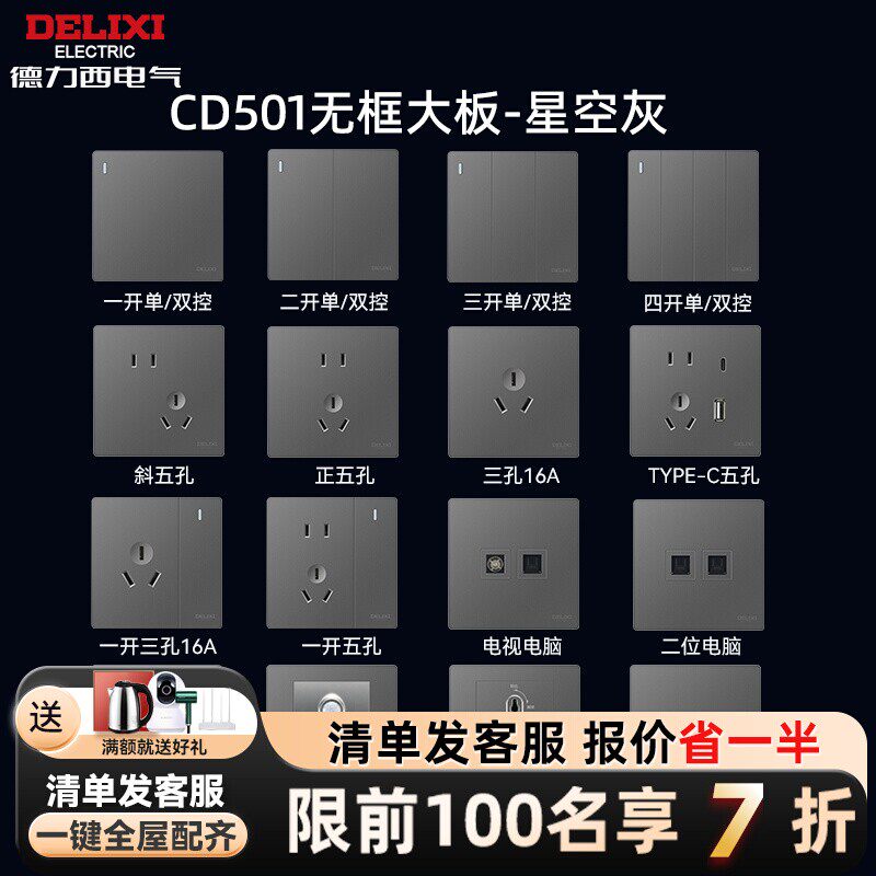 德力西侘寂风开关插座面板86三开单双控16a家用灯开关插座501灰白