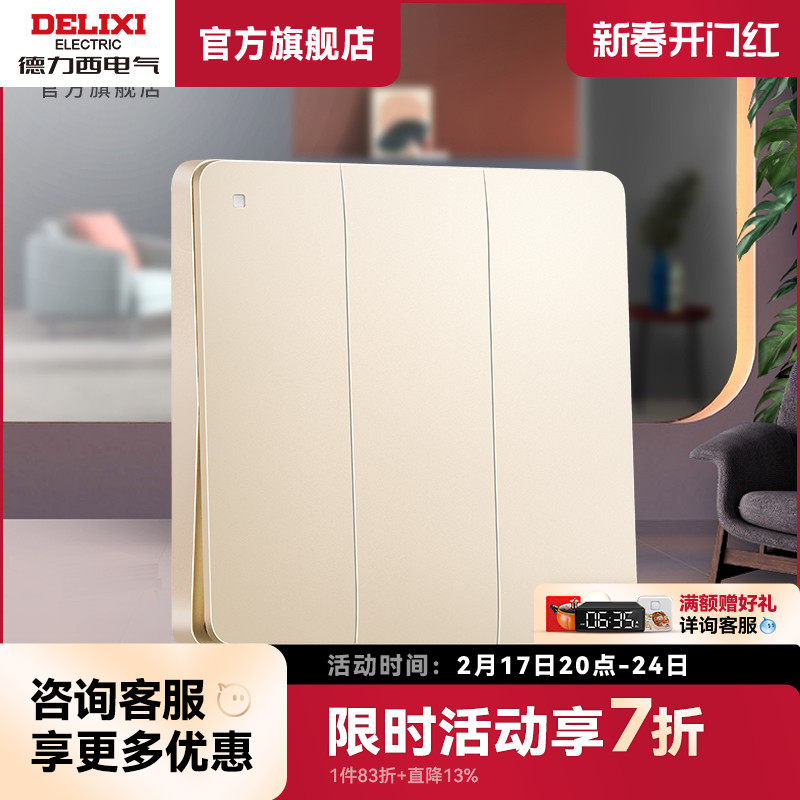 德力西墙壁暗装三位双控3开二双联开关插座家用电源金色86型面板