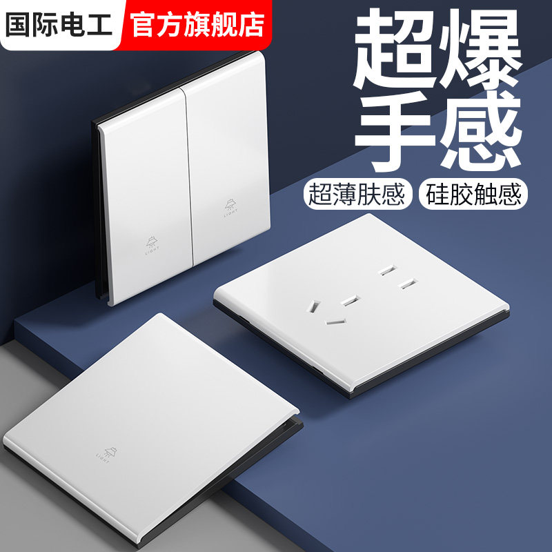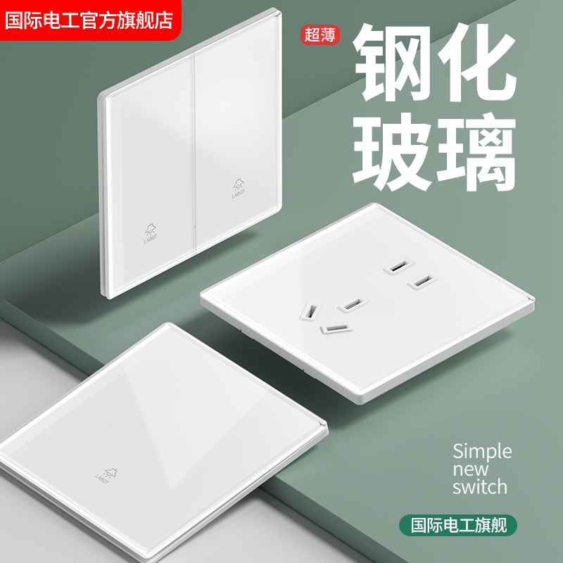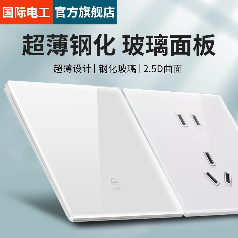 国际电工白色超薄钢化玻璃一开双控开关86型暗装面板家用五孔插座