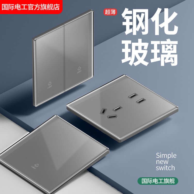 国际电工超薄开关插座灰色钢化玻璃暗装家用usb五孔面板一开双控