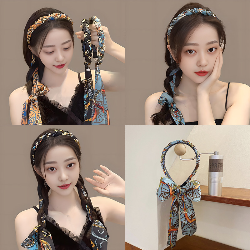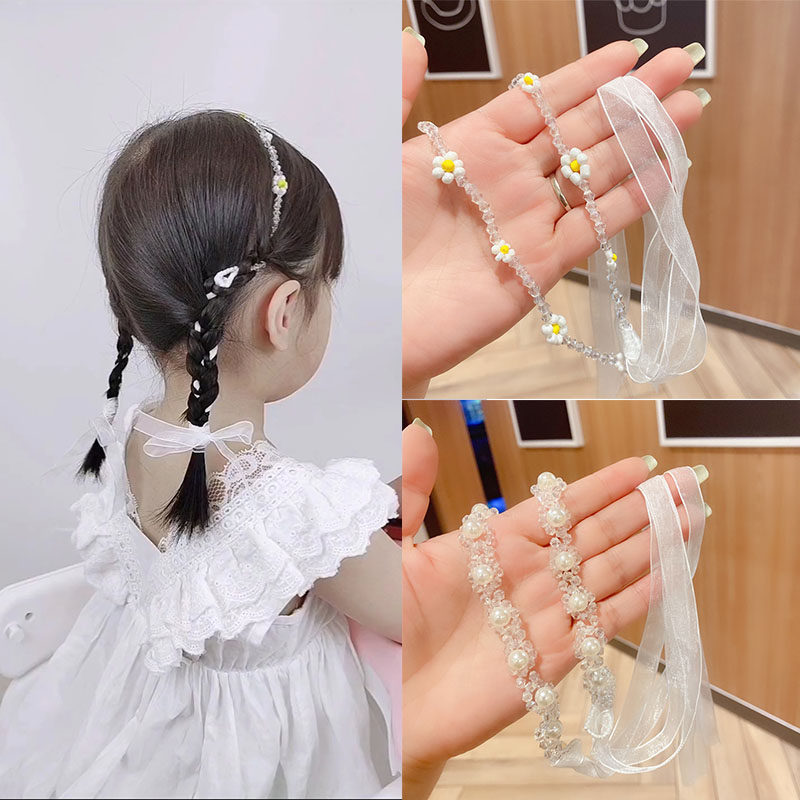 儿童编发飘带发箍女珍珠碎花发带丝巾绑发一体编发清新2023年新款