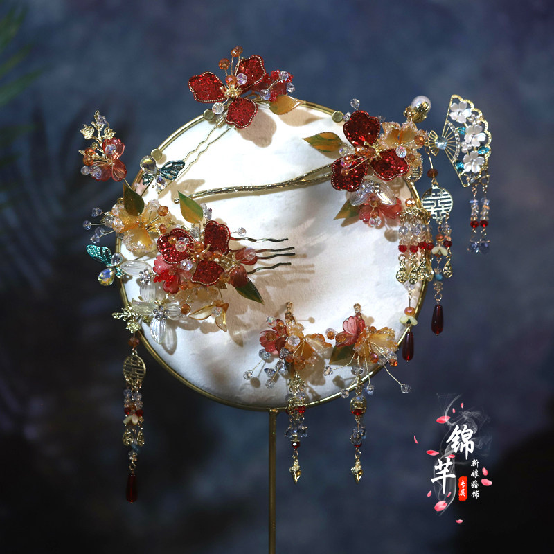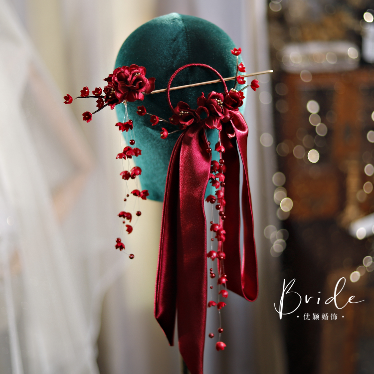 时尚造型中式风红色后盘发簪设计长流苏唯美古典风秀禾服新娘头饰
