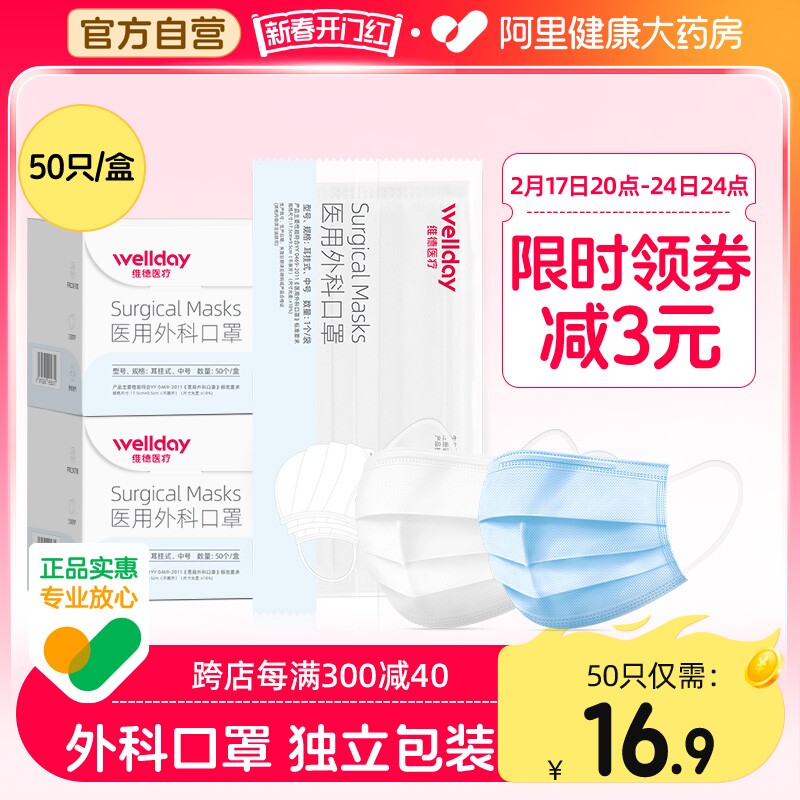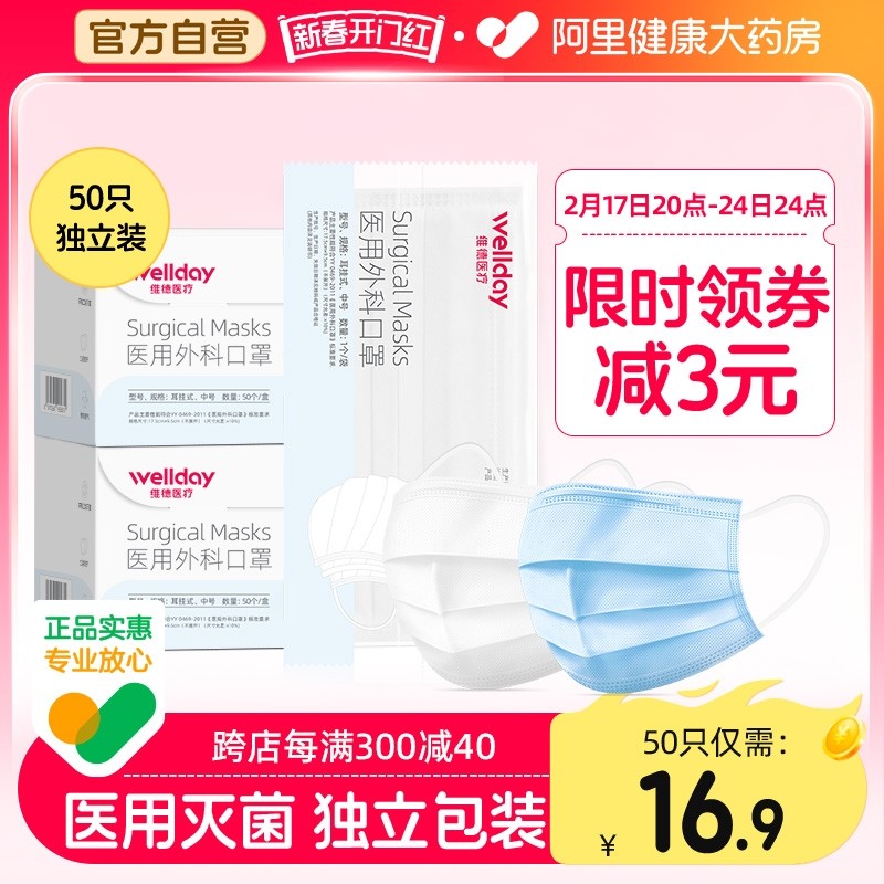 维德医疗一次性医用外科口罩三层熔喷灭菌防尘透气独立50只
