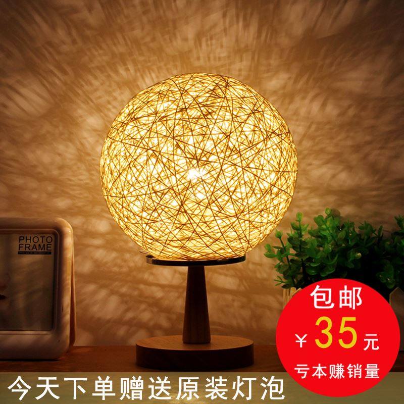 简约现代藤球台灯卧室床头柜台北欧创意时尚实木装饰球调光小夜灯