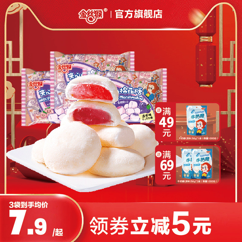 金丝猴夹心棉花糖168g*3袋白桃葡萄水果味糖果喜糖网红零食年货