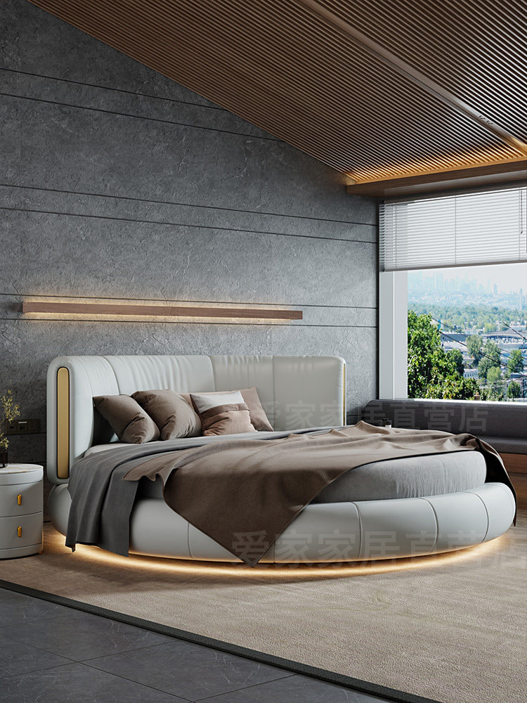 新款现代简约真皮圆床高档酒店悬浮床感应灯大户型主卧双人大床