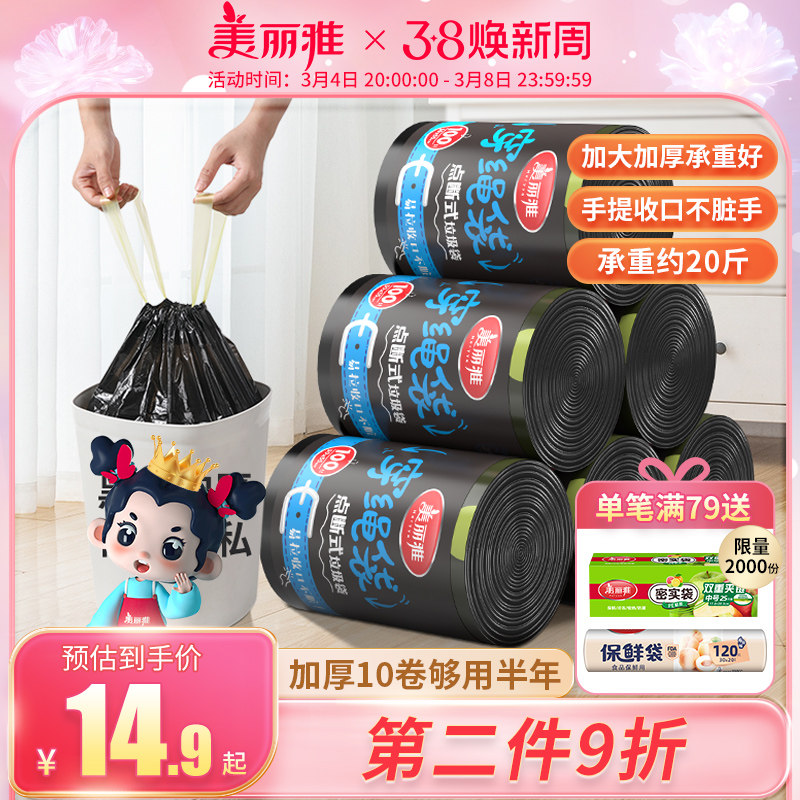 美丽雅垃圾袋家用手提式加厚厨余垃圾袋大号抽绳自动收口大卷装