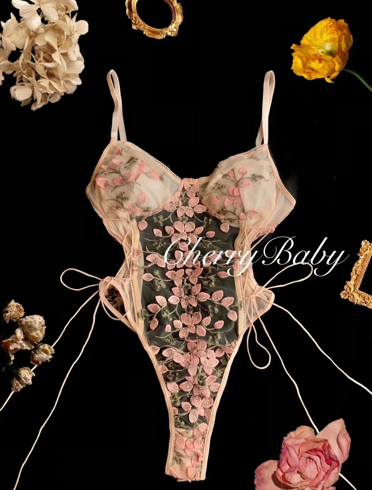今夕何夕性感塑身薄款紧身蕾丝网纱镂空透视连体内衣女印花带胸垫