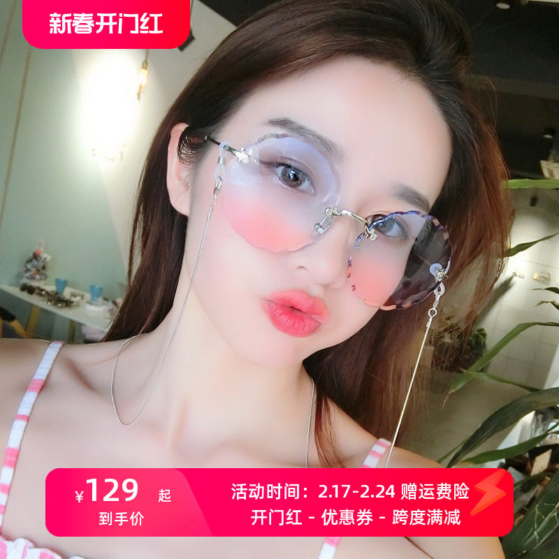 渐变色腮红眼镜女 无框挂链太阳镜 装饰粉色墨镜2023新款高级感