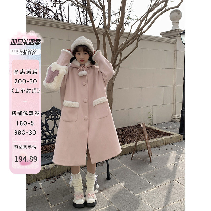 韩版设计款撞色包边双排扣宽松系带中长款双面呢外套 现货