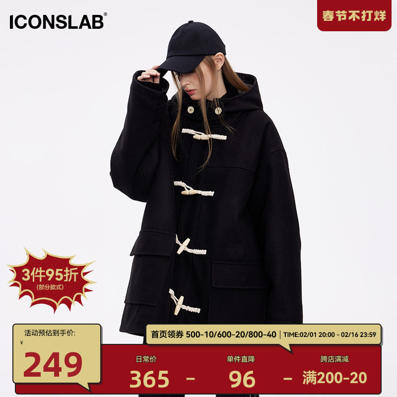 iconslab牛角扣连帽宽松毛呢棉衣外套冬季男女日系黑色大衣学院风